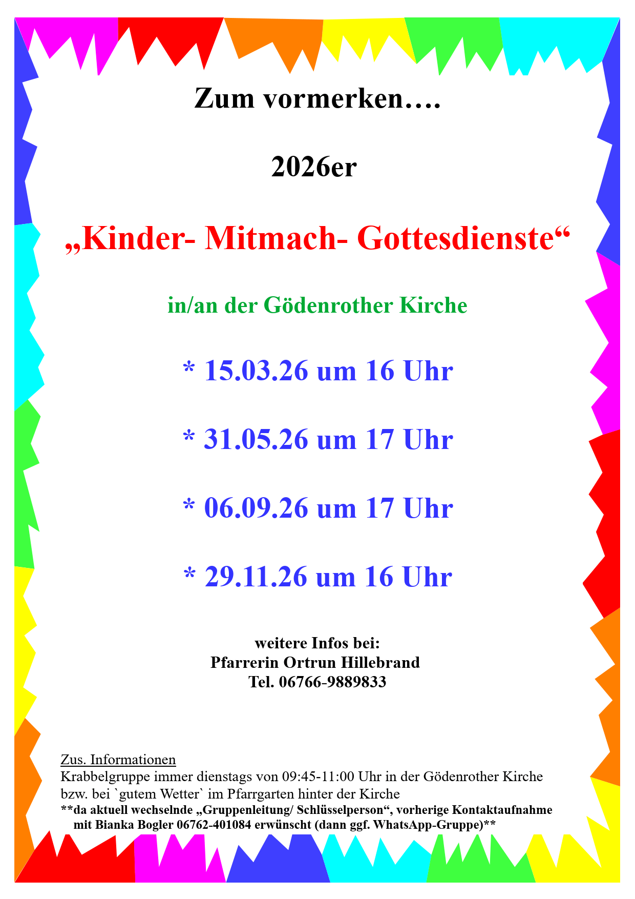 Kinder-Mitmach-Gottestdienst Home / Veranstaltungen / Datum 29/11/2026 Zeit 16:00 Kirche Gödenroth Hauptstrasse 33A